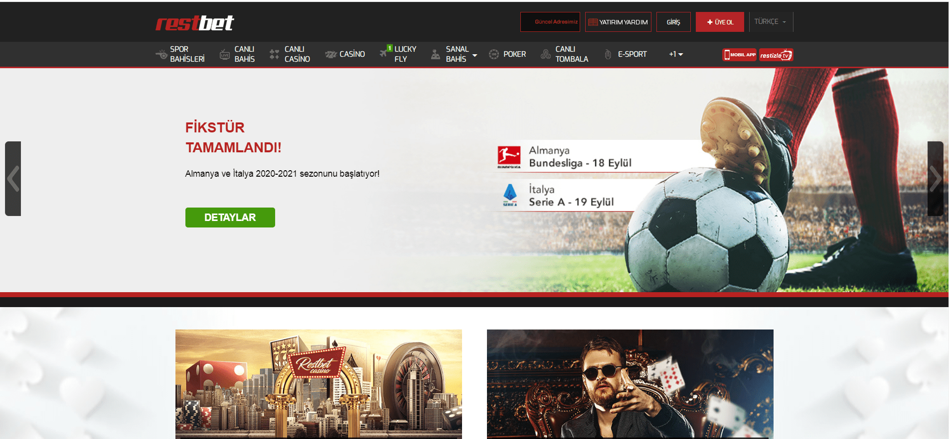 Restbet bahisler ile kazanmak istiyor iseniz, spor ve canlı bölümlerini kullanabilirsiniz. Spor bölümünde ulusal karşılaşmalara, Bundesliga, La Liga benzer biçimde ulusal karşılaşmalara yer verilmiştir. Bunun yanında Şampiyonlar Ligi benzer biçimde, UEFA Avrupa Kupası ya da Dünya Kupası benzer biçimde internasyonal karşılaşmalara yer verilmiştir. Aynı internasyonal ve ulusal anlayışın canlı bahisler bölümünde de geçerli olduğu görülecektir. Canlı bahislerde 15 civarı, spor bahislerinde 40 civarı değişik spor dalını her gün kullanma şansına haiz olacaksınız. Yüksek bahis oranı veren yabancı bahis siteleri yönünde bir araştırma yapıyor iseniz, restbet markası ile kati bir halde karşılaşacağınızı bilmelisiniz.
